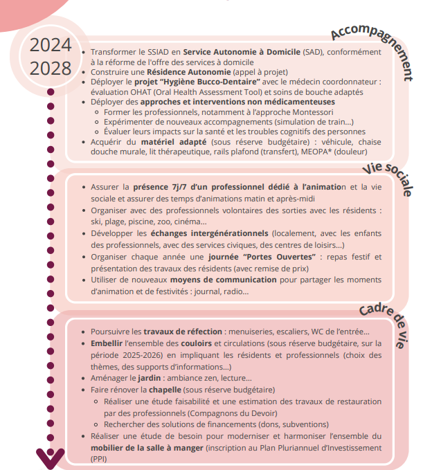 Elle supervise une équipe pluridisciplinaire de 60 personnes, au service des 65 résidents. Parmi ses projets figure la mise en place, vers 2025 et d’un service autonomie renforcé.