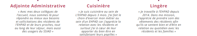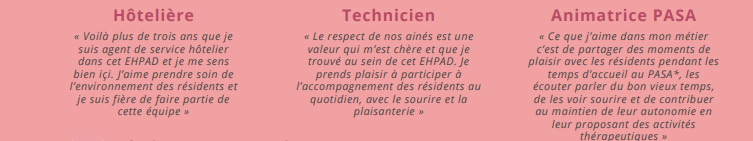 À travers leurs témoignages, ils partagent leur expérience, leurs valeurs et leur vision du métier auprès des résidents. Cette démarche vise à valoriser la diversité des compétences, à reconnaître l’implication de chacun et à témoigner de la dynamique collective qui anime notre établissement.